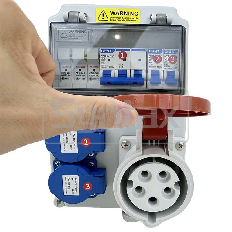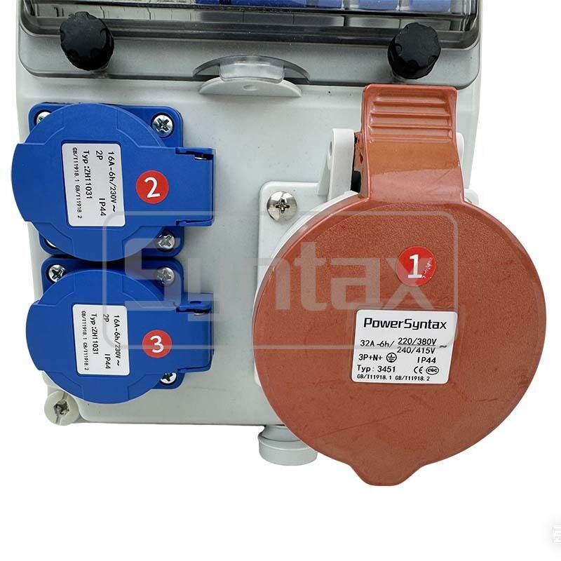1x 5P32400V IP44패널에 장착된 소켓 보호1x 3P32MCB. |